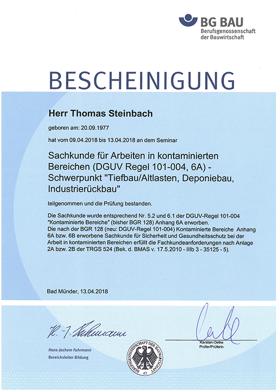 Herr Hauke Schiller und Herr Thomas Steinbach haben am 13.04.2018 erfolgreich am Seminar Sachkunde für Arbeiten in kontaminierten Bereichen (DGUV Regel 101-004, 6A) - Schwerpunkt "Tiefbau/Altlasten, Deponiebau, Industrierückbau" teilgenommen und die Prüfung bestanden.