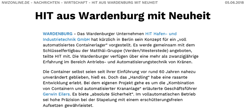 Ein Zeitungsartikel aus dem Weser-Kurier vom 10.12.2018. Ein Projekt von Matthäi Trimodalbau als ARGE
